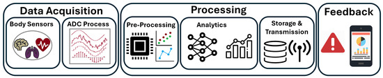 The key features of WMDs for physiological monitoring include portability, which requires battery power. Additionally, the smaller form factor of WMDs limits the battery size, necessitating lower power consumption from various processes. The most common processes performed by WMDs are shown in Figure 1. Vital signs are captured using sensors which transduce physiological activity into corresponding electrical signals. These analog signals undergo signal conditioning and filtering before being converted into digital signals through the analog-to-digital conversion process. Afterward, the data are segmented, reshaped, and formatted via preprocessing for further analytical processing. Various algorithms, including AI models, are used for analysis. Based on the results, feedback is provided. Additionally, the raw data or final results are stored locally in the WMD or transmitted to another device for further storage or detailed analysis.