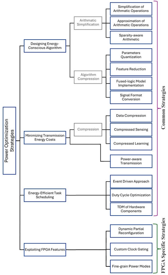 Likewise, the authors of [46] conducted a review on energy optimization for edge computing in mobile devices. While they touched upon several aspects of energy optimization at the device, application, and transmission levels, their primary focus remained on energy-efficient computation offloading and the corresponding execution mechanisms across various cloud environments. Notably, the review did not delve into application-specific optimization strategies for FPGA-based WMDs in physiological monitoring. In another work [47], the challenges faced by wearable devices, including energy efficiency, were reviewed and discussed. However, this work did not delve into energy optimization techniques, their classification, or the use of FPGAs in wearables. Furthermore, the authors of [48] classified energy optimization strategies into hardware (HW) and software (SW) levels. However, FPGA-based approaches were not explored. Last but not least, the authors of [49] comprehensively documented and classified energy optimization strategies, along with different architectural approaches. While their work is commendable, it primarily focuses on human context recognition applications and does not delve into FPGA-based optimization.