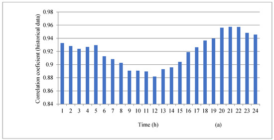 To implement the proposed scenario generation technique, a set of 100 correlated scenarios for wind speed is generated over 24 h using data from 25 March 2006, as shown in Figure 2. Initially, 5000 scenarios are generated with a spatiotemporal correlation for each farm. To reduce computational time, the total number of scenarios is then decreased to 100 using a fast-forward scenario reduction (FFSR) method [23]. As shown in Figure 3, reducing the number of scenarios does not significantly change the mean and STD of wind generation. The correlation coefficient between the wind production of two farms for historical data and generated scenarios is shown in Figure 4. As can be seen, the correlation coefficients for both datasets are very similar.