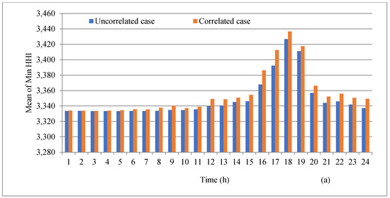 Minimum value of HHI with and without accounting for the correlation of wind generation in peak load level for (a) mean, (b) STD.