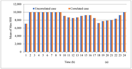 Maximum value of HHI with and without accounting for the correlation of wind generation in average load level for (a) mean, (b) STD.