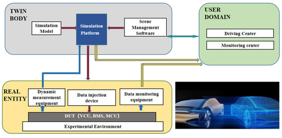 Digital twin (DT) technology involves creating a virtual simulation model corresponding to a real-world object, updated and optimized in real time through data feedback. Widely applied in automotive manufacturing, aerospace, and healthcare, DT enables simulation mapping of physical components and constructed models in virtual spaces during simulation tests, reflecting the actual operational status of physical equipment and enhancing development and testing efficiency [7,8]. Particularly in the electrical vehicle sector, to adapt to the development concept of a short iteration cycle of electric vehicle models, frequent product updates, and fast time-to-market, the digital twin simulation test before the prototype trial production, as an indispensable design method, can provide maximum help for the enterprise to develop their products as quickly as possible, and to save the cost of expenses, which is vigorously promoted by the automotive industry [9]. Therefore, the application of DT technology has gained promotion within the field of automotive testing.