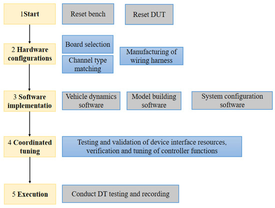 Thirdly, for the upper computer software platform, dynamic simulation software (ASM 2022) is used to establish the vehicle dynamics model, while MATLAB 2022b is employed to create the power system simulation platform. The configuration software configures the overall experimental setup, and the Control Desk 2021 is utilized to develop the testing interface and edit typical environmental parameters, with key signals designated for subsequent activation. The schematic diagram of DT bench technology scheme is showed in the Figure 3.