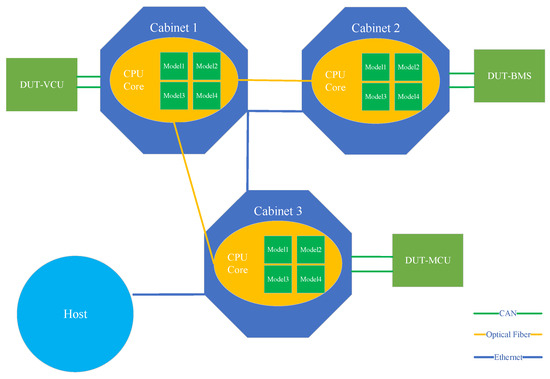 Considering that the VCU serves as the central control unit for the vehicle power system, this project adopts a configuration where Module 1 links to the VCU as the main cabinet, while Cabinets 2 and 3 are connected to the BMS (including both primary and secondary components) and MCU, respectively. Signal interaction among the three cabinets is facilitated through optical cables and Ethernet, while signal transmission and communication between the cabinets and the control unit under test are conducted via the CAN bus. The schematic diagram of the Sandian testing hardware connections is illustrated in Figure 4 below.