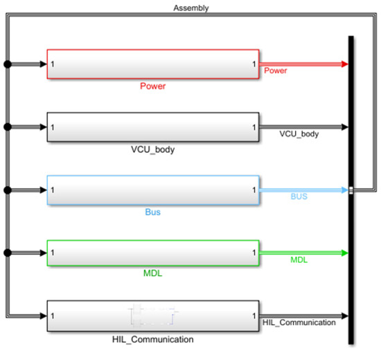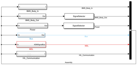 The BMS digital twin simulation model is constructed as illustrated in the following Figure 7. The BMS DT model includes not only the BMS hardware components, specifically the BMS-Body-In and BMS-Body-Out modules, but also comprises the MDL module that simulates BMS operation, the power module that controls the cabinet power supply, the Bus module responsible for communication between the power system, and the HiL_Communication module that facilitates signal forwarding between different cabinets.