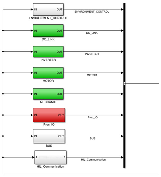 Accordingly, the MCU digital twin simulation model is built as shown below Figure 6. The MCU DT model not only includes the motor hardware itself (motor) but also incorporates a mechanical module (mechanic) that reflects the mechanical connection principles. Additionally, it features an inverter module (inverter) responsible for converting direct current (DC) to alternating current (AC) and a DC-link module that manages and applies the DC provided by the battery. The environment control module simulates the parameters of the MCU operating environment, while the Proc-IO module supplies power to the cabinet. Furthermore, the Bus module facilitates communication within the power system, and the HiL_Communication module handles signal forwarding between different cabinets.