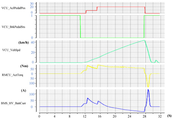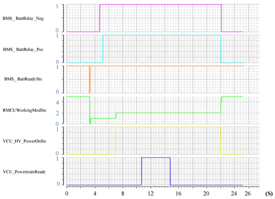 As shown in the Figure 10, during the power-up process of the powertrain system, the status flag signals of the BMS and MCU, specifically BMS_BattReadySts and RMCUWorkingModSts, transition from their initial default states (1 and 5, respectively) to the high-voltage standby state (0) at the 3.5 s mark. After 1.8 s in the high-voltage standby state, the BMS indicates the statuses of the main negative relay (BMS_BattRelay_Neg) and main positive relay (BMS_BattRelay_Pos), which switch from open (0) to closed (1), marking the completion of high-voltage power supply to the system. Once the VCU confirms the high-voltage power supply completion feedback from the BMS and MCU, it issues a command (VCU_HV_PowerOnSts = 1), which changes the motor status signal (RMCUWorkingModSts) from the high-voltage standby state (value 1) to the operational state (value 2). Subsequently, provided that there are no faults in the feedback from each controller, the VCU transitions the powertrain system to the ready state (VCU_PowertrainReady = 1).