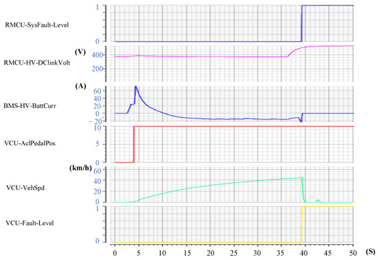 As shown in the Figure 12, when the driver presses the accelerator pedal (VCU_AclPedalPos = 10), the vehicle speed signal (VCU_VehSpd) begins to increase from zero. At the 36.6 s mark, the software ControlDesk 2021 is used to forcibly alter the MCU bus voltage signal (RMCU_HV_DClinkVolt) from the normal range of 375 V to an abnormal range of 525 V. This action prompts the MCU to report a level fault at the 39.1 s mark (RMCU_SysFault_Level = 1). Consequently, the VCU_Fault_Level also transitions to 1, causing the system to command the vehicle to decelerate to zero. The BMS working current (BMS_HV_BattCurr) gradually decreases to zero. The changes in signal behavior align with the predefined fault response mechanisms.
