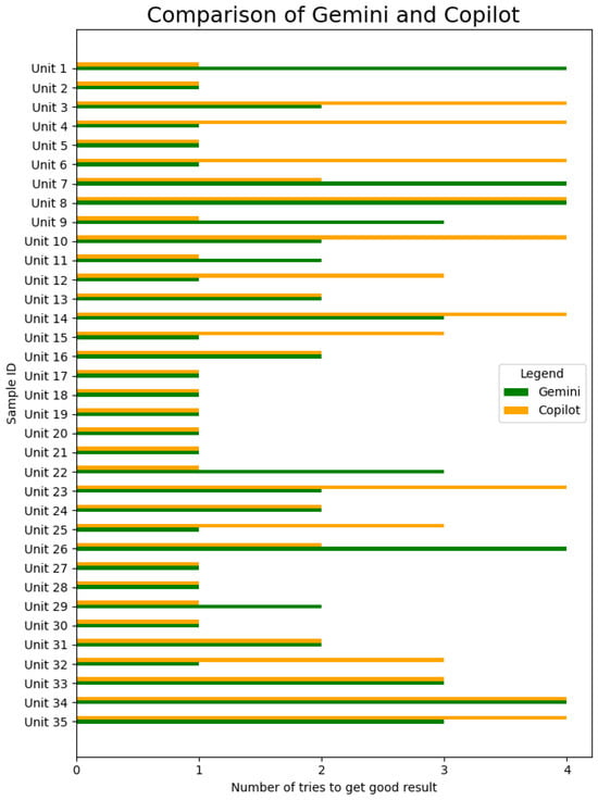 In this subsection, the LLMs’ capabilities in generating programming code from textual prompts are tested. Each LLM was given a maximum of five attempts to produce a functional code segment. This experiment involved all four LLMs: Bard (Gemini), AutoGPT, Copilot, and ChatGPT. If an LLM failed to generate a valid code segment after five attempts, the test was concluded as a failure for that segment. A total of 12 diverse code segments, representing various algorithms and methods, were selected for this purpose. This diversity was introduced to challenge the AI’s adaptability to different programming problems.