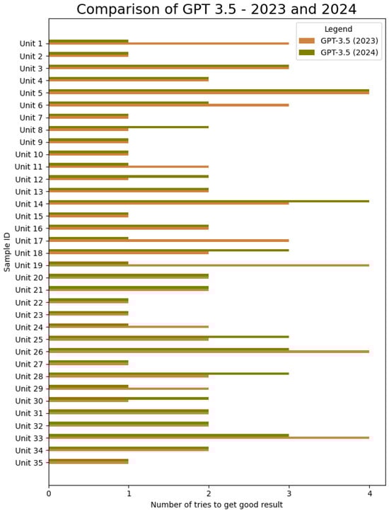 The number of tries needed to achieve a satisfactory result on definitions using GPT-3.5 (average 2.03 tries; 2023) and GPT-3.5 (average 1.86 tries; 2024).