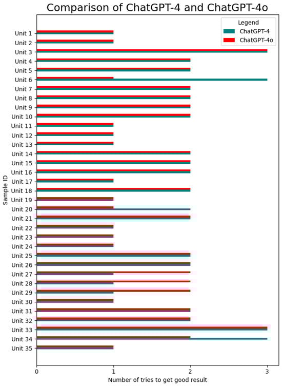 Figure 4 shows that ChatGPT-4 typically required only one or two prompts to generate an accurate definition, although there were two instances where it failed. Excluding these failures, the average number of prompts needed by ChatGPT-4 to reach a satisfactory definition was 1.68, indicating that, in most cases, two prompts were sufficient to achieve the desired result. The other LLMs performed slightly worse in comparison.