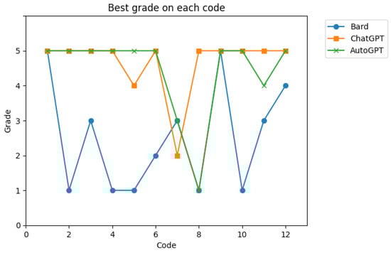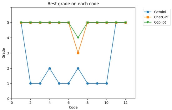 The performance scores (ranging from 5 for the best to 1 for the worst) are plotted for the four LLMs in Figure 5 and Figure 6 to compare the highest score achieved by each model across the different code segments. During the second evaluation, updated versions of the systems were introduced, bringing additional changes. AutoGPT was replaced with Copilot in the second comparison, and Bard was updated to its newer version, Gemini.