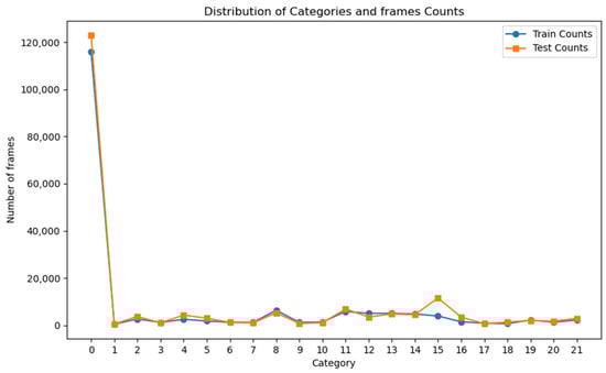 Distribution of frames per category in the Thumos14 dataset, where category 0 represents the background class.