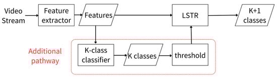 As an attempt to address the above-mentioned challenges, this paper proposes an innovative framework for online action detection, as shown in Figure 2, which incorporates an additional pathway between the feature extractor and the LSTR. The advantage of using a K-class classifier within this pathway is that it avoids the two aforementioned challenges by fusing the information obtained from the K-class classifier with the original model, leading to improved predictions.