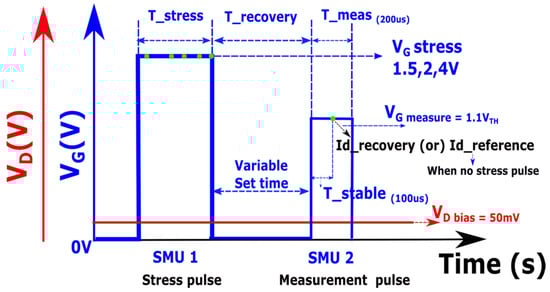 Normally-off lateral AlGaN/GaN-on-Si HEMT devices (650 V, 15 A) based on p-gate technology with a threshold voltage of 1.3 V were used in this study. The devices used are based on TSMC technology [12] with a 60–80 nm thick Mg-doped p-GaN layer, 15–25 nm AlGaN layer, and ~5 um GaN epitaxy layer grown on silicon substrate with an intermediate transition layer (Figure 1). The devices under investigation had a Schottky gate with a threshold voltage of 1.3 V, which, upon gate stress (1–4 V), showed a positive threshold voltage shift, as measured by a double pulse test [7]. The proposed recovery time measurement voltage technique (Figure 2) involves a ‘stress pulse’ where the gate stress (VG_stress) and the stress time (T_stress) can be defined. The gate stress is followed by a ‘measurement pulse,’ which is fixed at a gate voltage (VG_measure) 10% greater than a VTH with a fixed pulse width (T_meas). T_meas of the ‘measurement pulse’ is selected to ensure that ID is sampled precisely without the influence of measurement-induced stress. To estimate T_meas, the drain current (ID) is sampled over time at a VG bias of 1.1 VTH, and the time period in which the ID sampled is stable is chosen as T_meas [8,9]. For the samples under investigation, it was observed that at a VG bias of 1.1 VTH, ID reached a stable phase between 100 and 500 μs, interpreted as IDstable-Tzone (Figure 3), beyond which ID decayed rapidly. Thus, a T_meas of 200 µs was chosen for these samples in this analysis hereafter. The drain terminal (VD bias) was maintained at 50 mV throughout the course of measurements. The ID measured post-stress by the measurement pulse after a delay of T_stable is termed ‘ID_recovery’. The ID measured with no stress pulse by the measurement pulse after a delay of T_stable is termed ‘ID_reference’(Figure 2). The time interval between stress pulse and measurement pulse when ID_recovery matched ID_reference was estimated as the recovery time. The time interval was iteratively varied through various times to estimate the recovery time for a given condition. In all the measurements, ID_recovery was sampled after 100 µs with a measurement pulse of width 200 µs. Keysight B2912A high resolution SMUs were used to realize the measurement schematic involving variable VG_stress (1.5/2/4 V) levels and fixed VG_measure (1.1 VTH) pulses. Due to hardware programming interface limitations, a single SMU cannot be used to generate the stress and recovery pulse at different voltage levels. To overcome this, two Keysight B2912A high-resolution SMUs with a protection Zener diode [13], as shown in Figure 4, were used to realize the recovery measurement setup. The 2 SMUS were synchronized by a N1294A-032 I/O trigger cable and switched as required. The gate terminal was stressed at (VG stress) 1.5 V–4 V for various time intervals (T_stress) from 500 µs to 100 s by SMU1. The time taken for the depleted 2DEG channel to recover to prestress levels was sensed by ID sampled in the measurement pulse by SMU2, as shown in Figure 2. Post-stress, depending on the extent of positive (+ve) VTH shift, a drop in ID (2DEG density in the channel) sampled at VG_measure by the measurement pulse relative to prestress levels was seen. The VG_measure was chosen at optimum levels (1.1VTH) to ensure that it was close to VTH.