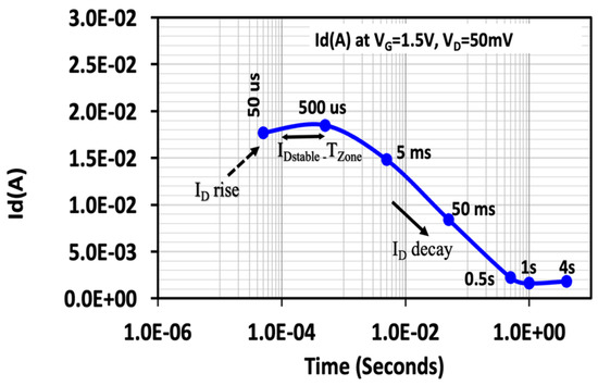 ID sampling at constant VG of 1.5 V showing the IDstable-Tzone 100–500 µs where ID is stable pre-falling ID and post-rising ID.