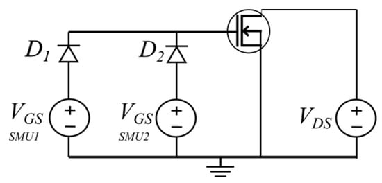 Schematic of the measurement setup where SMU1 and SMU2 are alternatively switched, corresponding to the VGS test waveform shown in Figure 1.