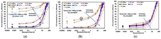 If VG_measure is >> 1.1 VTH, there exists a possibility that the 2DEG channel density is too high relative to the 2DEG changes caused by gate stress, thus making the ID measured insensitive to stress and recovery. In other words, the ID sensed would be from the constant regime of ID-VG transfer characteristics, as shown in Figure 5, missing the dynamic component caused by stress. Post-stress ID, thus measured by measurement pulse after a recovery time (iteratively changed), is plotted as % normalized with respect to ID_reference (prestress channel currents measured at VGS = 1.1 VTH, VDS = 50 mV), as shown in Figure 6a–c. For example, after a 2 V, 500 µs stress pulse was administered, followed by a recovery time of 0.05 s; the ID measured in the measurement pulse was 35% of ID_reference, as shown in the encircled in Figure 6b. ID_reference is shown as 100%, and the % recovered with respect to various recovery times is plotted to observe the recovery dynamics. The time when % ID recovered reaches 100% is representative of the time taken for the VTH to recover post-stress, corresponding to the stress voltage/time. By employing this technique of using a short measurement pulse instead of a complete transfer characteristic sweep, the effect of measurement-induced VTH instability was removed, providing an actual estimate of the recovery time. This recovery time measurement approach, post VTH instability, can be an apt representative replacement for the existing methods. The effect of stress time and stress voltage on VTH recovery dynamics and recovery time are shown in Figure 6a–c, Figure 7, Figure 8a–f, and Figure 9, respectively.