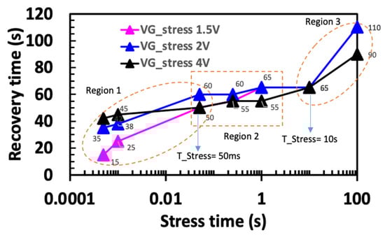 Effect of VG stress time on the recovery time extracted by the proposed technique illustrating the recovery trends.