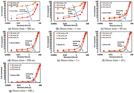 Dynamics of VTH recovery measured by time taken for ID post-stress to recover to prestress levels (ID-reference, equivalent to 100% ID recovered in the Y axis) across varying stress voltages (1.5/2/4 V) at various stress times (500 µs—(a); 1 ms—(b); 50 ms—(c); 250 ms—(d); 1 s—(e); 10 s—(f); 100 s—(g)).