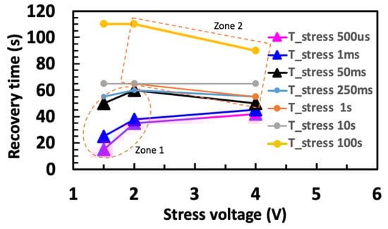 - As stress voltage increases, recovery time also increases until a critical stress voltage (2 V), beyond which recovery time plateaus.