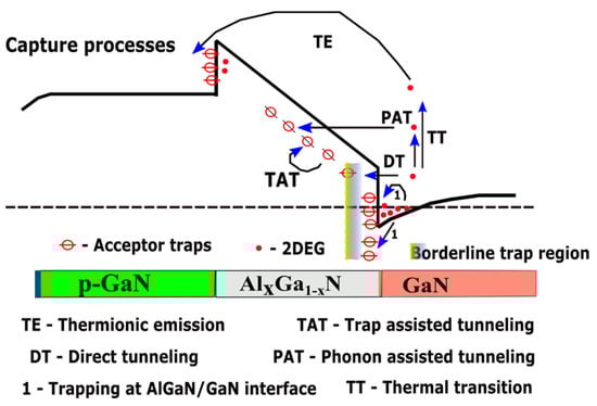 The 2DEG depletion causing the positive VTH shift can be explained by the trapping of the 2DEG electrons during the positive gate bias. At the positive gate bias, a vertical field pull can cause trapping of 2DEG electrons at four possible locations/regions: (a) the pGaN/AlGaN interface, (b) the AlGaN bulk, (c) the AlGaN/GaN interface, and (d) the AlGaN/GaN interface and borderline region (some nanometers inside the AlGaN region from the AlGaN/GaN interface is referred as the borderline region). Various capture processes are in play depending on the trapping location, as depicted in Figure 10. For example, direct tunneling (DT), trap-assisted tunneling (TAT), and phonon-assisted tunneling (PAT) are processes associated with 2DEG trapping at the AlGaN bulk. Thermal transition and thermionic emission are the capture processes associated with 2DEG trapping at the p-GaN/AlGaN interface. Direct capture, direct capture together with borderline hopping, are the processes associated with 2DEG gettting trapped at the AlGaN/GaN interface and borderline region. The capture time varies depending on the location of traps and the respective processes involved. The stress time or the stress voltage can effectively control how many 2DEG electrons are trapped and the location where they are trapped. However, the trap energy levels, trap density, and their distribution are fixed irrespective of the stress voltage (operational levels) and time. Hence, the recovery time is solely dependent on the emission. The emission time [14] is given by Equation (1)