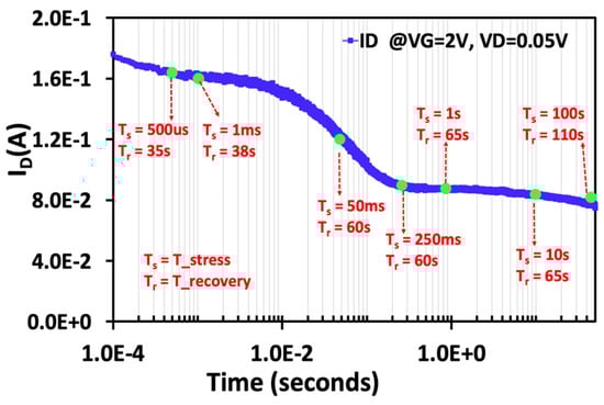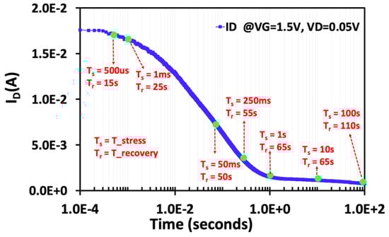 Figure 11. ID sampled at VG bias of 1.5 V over various stress times (Ts) and respective recovery times (Tr) extracted by this technique.