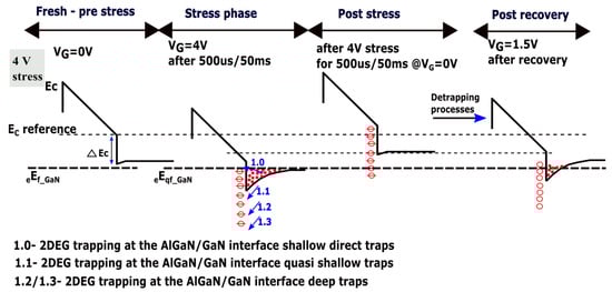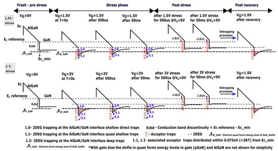 Having empirically hypothesized the trapping location, the trapping processes during stress and emission processes post-stress at the AlGaN/GaN interface, represented in terms of band diagram, are graphically illustrated for VG_stress values = 1.5 V and 2.0 V. Prestress, the conduction band minima (EC_min) is above the GaN buffer electron fermi level (eEf_GaN), signifying the normally-off operation; the difference between the EC_reference and the EC_min is the conduction band discontinuity (Ecbd), which remains constant irrespective of stress voltage/time. On application of +ve gate voltage (Time = 0), EC_min moves below eEf_GaN, forming a 2-dimensional quantum confined space holding the 2-dimensional electron gas (2DEG). Over time (stress phase), the 2DEG starts to get trapped at the shallow acceptor traps (ET_shallow) at the AlGaN/GaN interface due to the field pull (processes 1.0 and 1.1, respectively, in Figure 13).