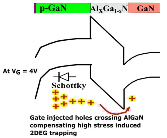 Illustrative band diagram at VG = 4 V across the gate stack showing gate-injected holes crossing the AlGaN barrier.