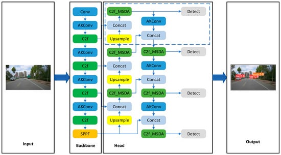The proposed AMW-YOLOv8n algorithm’s network structure, illustrated in Figure 1, comprises four components: input, backbone, head, and output. This study enhances the backbone’s feature extraction by introducing Adaptive Kernel Convolution (AKconv). AKconv dynamically adjusts the convolution kernel’s shape and size, enabling the network to better handle features of different scales. This improvement enhances the model’s capability to accurately detect targets of varying sizes, particularly in complex road scenes.