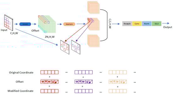 Figure 2 shows a detailed schematic diagram of the AKconv structure. The input image dimensions are (C, H, W), where C stands for the number of channels, and H and W correspond to the image’s height and width, respectively. AKconv provides a distinct initial sampling shape for the convolution kernel. The convolution operation uses Conv2d to process the input image, while the offset component adjusts the initial sampling shape through learned offsets. This step is crucial for AKconv, allowing the convolution kernel shape to dynamically adjust to adapt to the image features. The resampling component adjusts the feature map according to the modified sampling shape. This adjusted feature map is then reshaped, convolved again, normalized, and finally activated using the SiLU function. The three rows below show the changes in sampling coordinates: The initial sampling positions of the convolution kernel, indicated by the original coordinates, exclude any offsets. The offsets show the learned offsets that will be applied to the original coordinates, and the modified coordinates show the sampling coordinates after applying the offsets.