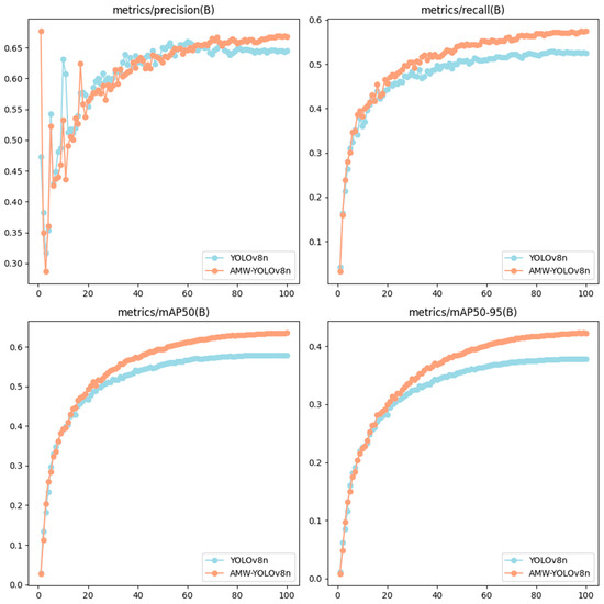 To illustrate the detection performance of the proposed algorithm, a comparative experiment was conducted. The four metrics of the proposed AMW-YOLOv8n algorithm, mAP50, mAP50–95, P, and R, are shown in Figure 4. The proposed model converges smoothly, and all four metrics, mAP50, mAP50–95, P, and R, show improvements compared to YOLOv8n, proving the effectiveness of the improvements in the algorithm.