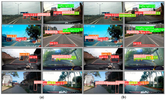 Figure 5 compares detection effectiveness. Figure 5a displays the results of six images using the YOLOv8n algorithm, while Figure 5b shows the results using the proposed AMW-YOLOv8n algorithm. By comparing the detection results of six sets of the same scenes, it is evident that the AMW-YOLOv8n algorithm is capable of detecting a greater number of targets compared to other methods, including densely packed small targets and occluded people and vehicles. The proposed algorithm also enhances overall detection accuracy. The comparison of detection results demonstrates that the AMW-YOLOv8n algorithm excels in detecting targets in complex road scenes, effectively addressing occlusion and reducing missed detections of small targets.