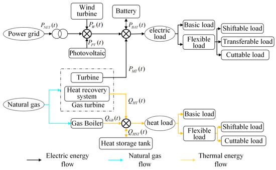 With the continuous progress of energy utilization technologies, energy management at the load side is receiving increasing attention [2]. Some references [3,4] proposed flexible load, which is a kind of electric load that can be adjusted according to grid demand, market price, and environmental conditions. Currently, a large amount of research has been conducted at home and abroad to explore the potential of flexible loads in the optimal scheduling of power systems [5,6,7]. In [8], the “heat and power decoupling” of combined heat and power (CHP) units was realized through the addition of electric boilers at the “source” site and the scheduling of flexible demand at the “load” site. The current community integrated energy systems’ (CIES) optimal scheduling is mainly aimed at reducing the cost of running the system but often ignores the ecological price in the process of system operation. In the CIES scheduling model that pursues both economic and environmental benefits, the proposal for a trading scheme offers a fresh solution to cutting carbon pollution. Reference [9] proposed a step-by-step carbon trading expense calculation scheme for CIES with an electricity, heat, and gas combined supply, and reference [10] successfully introduced the emissions trading mechanism to the integrated energy network, which improved the efficiency of energy use and lowered the carbon balance of the energy system. References [11,12] established an integrated demand response mechanism on the basis of time-of-day electricity rates and the impact of various types of behavior, including both horizontal and vertical response, on the low-carbon balance of the system.
