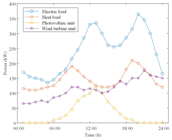 This work adopted a CIES as the investigation unit, including gas turbine, wind turbine, photovoltaic, storage battery, heat storage tank, and other units, with comprehensive consideration of flexible loads, carbon trading, time-sharing tariffs, and other factors, taking 1 h as a unit planning duration and 24 h as a scheduling cycle. The predicted loads of electricity and heat and the predicted outputs of the wind turbine and photovoltaic (PV) are shown in Figure 2, and the parameters of each unit, carbon emission coefficients, and quota coefficients are shown in Table 1 and Table 2.