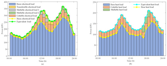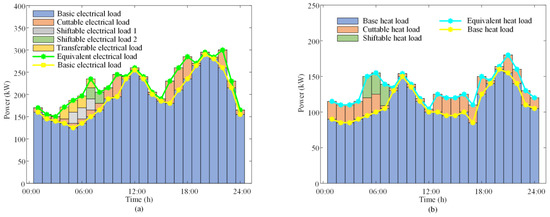 Transferable loads are more flexible than leveling loads, under the premise of meeting the overall load remaining both before and after the transfer. The power consumption of any time range can be configured with flexibility, the power consumed time range is allowed to be interrupted, and the duration of the time period is not fixed, for example, a smart water heater, which can be easily configured depending on the user’s habits of the use of time and power. Considering that users are more sensitive to thermal load, this work did not consider the transferable load characteristics in thermal load.
