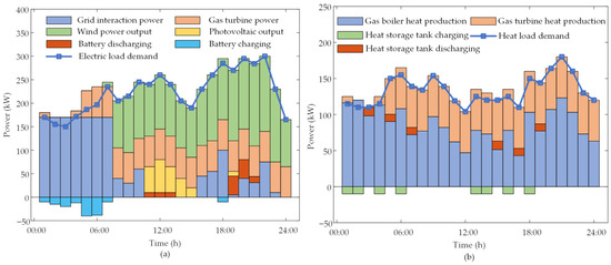 In Figure 5, regarding the power load, during the time of 00:00~07:00, the price of electricity was in the valley and the cost of power was CNY 0.25/kWh. At this time, the demand of the electric load was low and there was no PV output. The operating price of the wind turbine was CNY 0.52/kWh, which was more than the price of the purchased power. Thus, the electricity was preferentially supplied by the network and no PV and wind turbine output occurred until 08:00. The gas turbine was used as a supplement to the power purchased from the grid to provide a certain amount of power. The excessive power was charged by the battery; at 10:00~15:00 and 18:00~21:00 h, the cost of power was in the peak hours and the cost of purchasing power was high. At this time, the wind and photovoltaic energy was plentiful and the cost of power was lower than that of the power obtained from the network. Therefore, we made extensive utilization of wind and light resources to supply energy to minimize the acquisition of power. The storage battery was in the range of 00:00~07:00 and 18:00, other tariffs in the valley charged for energy storage at 11:00~13:00 and 19:00~21:00, and other tariffs in the peak hours charged to release power, to take full advantage of the spread between high and low tariffs to reduce the cost of running the system.