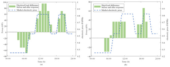 (a) Relationships between the difference in electric load before and after demand response and the market price of electricity. (b) Relationships between the difference in heat load before and after demand response and the market price of electricity.
