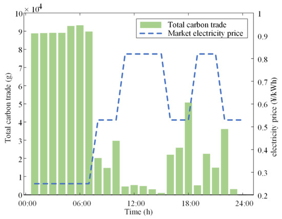 As can be seen in Figure 9, the total amount of carbon transactions was larger during lower electricity prices and smaller during higher electricity prices because the differentiated electricity price incentive mechanism encourages users to use electricity during lower electricity prices (usually when electricity demand is lower), thus reducing electricity demand during peak hours. This demand shifting helps to reduce reliance on high carbon emission electricity (e.g., coal and gas-fired generation) during peak hours, thereby reducing carbon emissions.