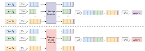 We introduce an innovative module called Quantum Fusion Module (QFM), which demonstrates exceptional performance in aggregating all token embeddings. This significantly enhances the accuracy of the binary classifier in predicting the relationship between question and passage, thus guiding the decoder more effectively to generate accurate answers. QFM consists of three main parts: embedding transformation layer, quantum state generation layer, and quantum feature fusion layer. First, QFM utilizes two learnable embedding layers to convert the original embeddings into the real domain (amplitude) and complex domain (phase) of the Hilbert space. This transformation not only preserves the semantic information of the original embeddings but also provides the necessary parameter for subsequent quantum state generation. Second, based on the calculated amplitude and phase of each token, a specific embedding of QPS of the wave function is constructed. The QPS captures the state of each token, thereby enhancing the ability to represent complex semantic relationships. Finally, through a classical mixture method, all QPSs are aggregated to obtain a QMS. The QMS contains all token embeddings and is used to determine whether the corresponding passage is a rationale for the question. By providing the binary classifier with more precise embedding inputs, the QFM module enhances the classifier’s accuracy in determining whether the passage is indeed a rationale for the question.