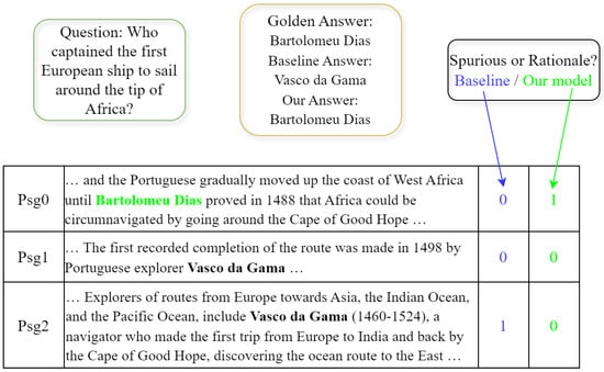 An example from our experiments. The question has only one relevant passage (Psg0), while the other passages contain incorrect answers to the question. A 0 indicates that the model believes there is a spurious feature between question and passage, while 1 indicates that the model believes there is a causal relationship between question and passage.