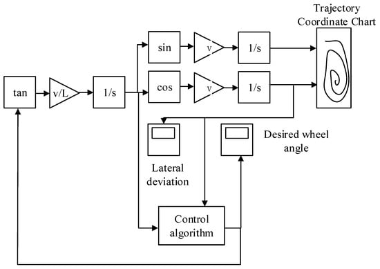 In Equation (5), arctan is the arctangent function, and δ is the front wheel angle under control processing. Based on the above, the tracking model for the control simulation can be obtained, see Figure 4.