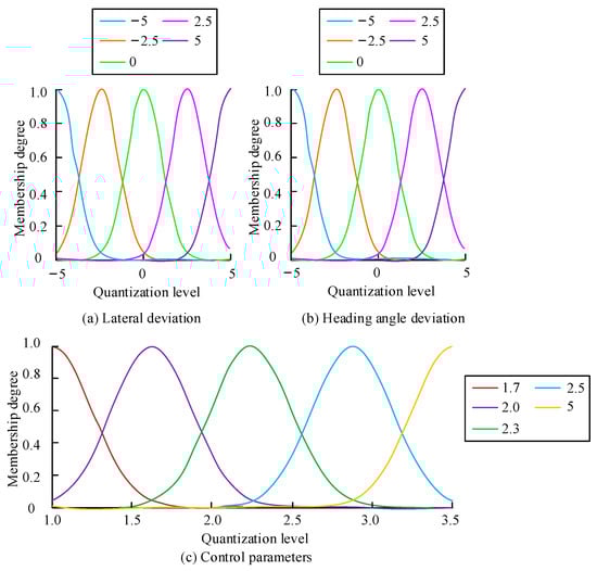 The domain for setting the control parameters is [1, 3.5], the quantisation factor is 1, and the quantisation level can be divided into {1,1.7, 2.3, 2.9, 3.5}. The domain for lateral deviation and heading angle deviation is [−0.5 m, 0.5 m] and [−30°, 30 °], and the quantisation level is divided into {−5, −2.5, 0.5}. The membership functions for the control parameters, lateral deviation, and heading angle deviation are all Gaussian functions, and the membership functions for each variable are shown in Figure 3.