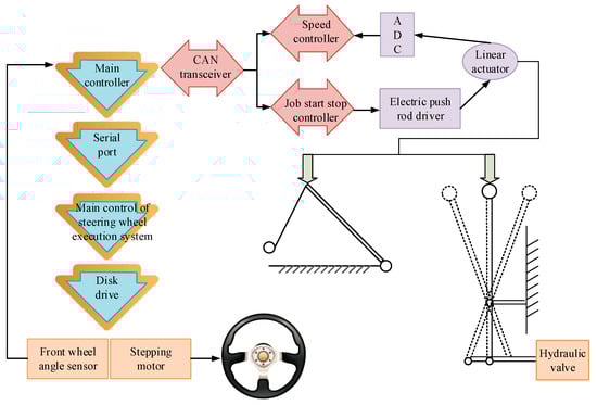 In order to facilitate the realisation of automatic steering of the vehicle, this study provides a motor power source for the steering wheel and the wheel turning angle joint main controller in the controller cycle by changing the message situation to achieve speed control. The throttle pedal in the electric actuator contracts and extends during the movement, so this study focuses on the controller’s conversion module to achieve, based on the feedback actuator information, the formation of closed-loop control of the throttle. The speed of agricultural machinery is adjusted by the throttle position, and the more the throttle pedal is pressed, the faster the vehicle’s speed. To achieve automatic driving of agricultural machinery, a speed regulation and control system has been researched and designed. In this system, the electric push rod controls the depression of the accelerator pedal through a steel cable connected to the accelerator pedal. When the electric push rod contracts, the accelerator pedal is pressed down; when extended, the accelerator pedal returns upward due to the action of the spring. The push rod is equipped with a sliding rheostat inside, and the slider changes with the movement of the push rod. Therefore, the voltage of the sliding rheostat can be measured through the AD conversion module of the controller to obtain the position information of the push rod, which is used for closed-loop control of the throttle position. The speed controller receives throttle position instructions from the main controller, uses the push rod position feedback read by the AD module, and adjusts the push rod to the desired position through PID control algorithm to achieve automatic speed adjustment. The actual position of the throttle will also be transmitted back to the main controller through the CAN bus. At the same time, this study focuses on the selection of agricultural machines for console switching toggles through the main controller to achieve the control of the toggle and automatic switching. Figure 6 shows the schematic diagram of the construction of the system parts of the agricultural machine.