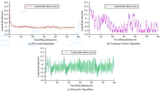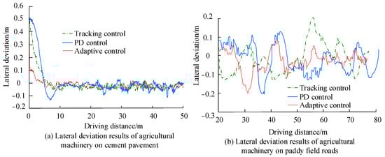 The results in Figure 8 show that the lateral deviation curves of the PD control algorithm under different travelling distances vary with large ups and downs, and their maximum and minimum values reach 0.046 and −0.032, respectively, with obvious fluctuations. The fuzzy adaptive PD algorithm, on the other hand, has a smaller deviation value in path tracking, and shows better stability overall, with its average absolute error reaching 0.0425. Considering the absolute value of deviation of the multi-deviation feedback control algorithm, the absolute value of deviation maxes out at 0.0243 m, and the average absolute error turns out to be less than 0.005 m, which is of high tracking accuracy. The result in Figure 8 indicates that traditional PD control algorithms use proportional and differential terms to respond to errors, making it difficult to handle the dynamic characteristics of nonlinear systems of agricultural machinery in operating environments. When there are disturbances (such as terrain undulations, soft soil, wind interference, etc.), it may lead to a decrease in tracking performance. The performance of the PD algorithm highly depends on the selection of control parameters. If the parameters are not properly adjusted to adapt to the specific conditions of agricultural machinery operation, it can also lead to poor control effectiveness. The control algorithm proposed in this study is a combination algorithm that can effectively handle uncertainty and adapt to complex environments. Then, the performance of the control algorithm proposed in this study is further compared with PD control [32] and adaptive control [33], and the results are shown in Figure 9.