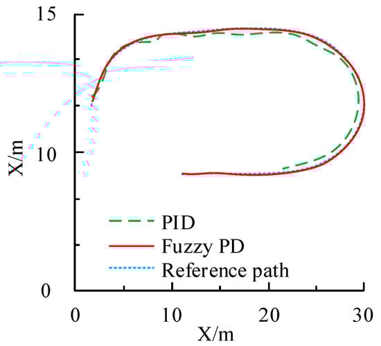 Among them, the tracking control algorithm refers to path tracking control based on an unmanned navigation positioning system, and adaptive control is the PD algorithm. The proposed algorithm is a fuzzy adaptive PD algorithm that combines the multi-deviation feedback nonlinear control method with the PD algorithm. The direction deviation weight of the proposed adaptive fuzzy control algorithm is 1, the curvature deviation weight is 3, and the speed deviation weight is 0.05; the proportional adjustment coefficient in the PD control algorithm is 1.2, and the differential adjustment coefficient is 2.0. The preview distance of the pure tracking algorithm is set to 2 m. This study utilises the kinematic model of agricultural machinery and MATLAB tools for the simulation analysis. The initial lateral deviation is set to 0.5 m, the vehicle speed is set to 1 m/s, and the wheelbase of the agricultural machinery is set to 1.06 m. Figure 8 shows the results of the driving path tracking.