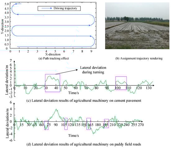 In Figure 12, when in the concrete field, the maximum deviation of the straight-line section of the control system platform is 2.75 m, and the average value of the deviation of the turning section reaches 2.05 m. The large oscillation situation is mainly manifested in the turning section, and the stability of the overall control process is better. In the paddy field deviation results, the average value of the lateral deviation in the straight section is 2.03 m, and the average value of the deviation in the turning section is basically 2.54 m. According to the operation quality standard of the agricultural machine, it can be seen that the row spacing of the operation should be ≤5 cm, and the statistics of the experimental results show that the actual path deviation points account for less than 5 per cent of the actual number, which indicates that the design system can better meet the operational requirements and the qualification rate is high. The planning results of agricultural machinery operating in paddy fields are subject to certain deviations due to factors such as soil moisture and road surface smoothness. The difference between the two operating environments of agricultural machinery is due to the special nature of paddy fields. The soil in paddy fields usually has a higher moisture content, making the ground softer and smoother. The traction of agricultural machinery tyres is affected, which affects the accuracy of steering and the stability of driving. The water level in paddy fields may change due to irrigation, rainwater accumulation, or evaporation, directly affecting the difficulty of agricultural machinery operations and their adaptability to the ground. The driving of agricultural machinery in paddy fields requires sufficient power to overcome the resistance of water and the friction of muddy soil, and its power system will inevitably affect the path tracking results.