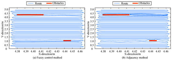 To further verify the adaptability of the fuzzy control method proposed by this research institute, obstacles were set up in farmland, which were, respectively, arranged in the first and second half of the farmland planning route. Subsequently, the adjacent method was used as a comparison algorithm to analyse the turning effect of the agricultural machinery operations, and the adjacent method [34] operated according to adjacent strips. The results are shown in Figure 13.