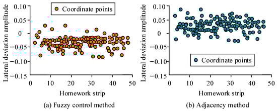 The red part in the picture represents obstacles. The results of the graph indicate that the fuzzy control method used in this study performs better than the adjacent method in terms of work area and work distance, with an average improvement of 9.5% and 8.4%. In addition, this method can effectively avoid obstacles, reduce the area of turning areas, and has strong adaptability. A farmland operation plan route can reduce sharp turns and drastic flight changes, thereby reducing the risk of collisions. However, the operation plan route of the comparative method has bends and partially dense situations. Curved operation routes may be limited by the terrain of farmland, surface obstacles, etc., which may cause the machinery to be unable to move in a straight line during operation, resulting in a high risk of collision. Frequent turns may cause the equipment to be unable to avoid ground obstacles due to the need to adjust the angle. The deviation situation of the two methods during farmland operation was analysed, and the results are shown in Figure 14.