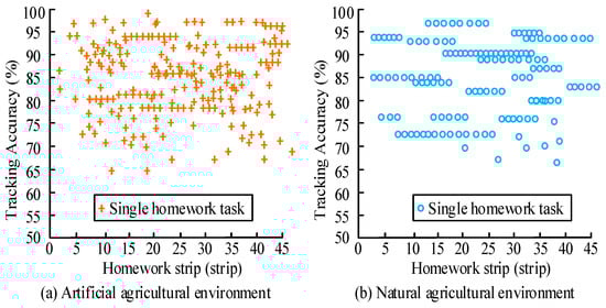 The results in Figure 14 indicate that the proposed fuzzy control method has a smaller lateral deviation during operation than the adjacent method, and its deviation values on different bands are all at (−0.05,0), with an average lateral deviation value of −0.034. The lateral deviation results under the adaptation method vary significantly, especially near obstacles, with an overall average lateral deviation value of 0.042. The above results indicate that the proposed fuzzy control method exhibits good deviation adaptability and stable processing performance in job planning. The path tracking deviation results of different operation sections were analysed and the results are shown in Table 4.